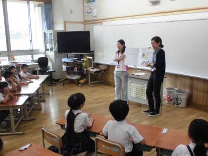 1年生では英語絵本の読み聞かせもしてくれて,子どもたちもいろいろな動物の英語での言い方も教えてもらいました。