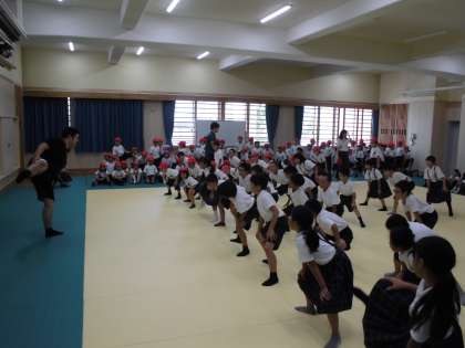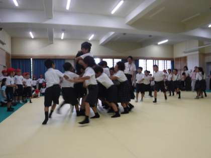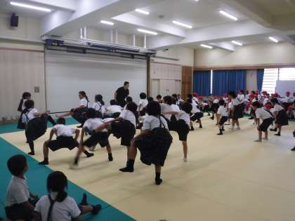 教育実習に来てくれている先生との「ふれあいタイム」。相撲部出身の先生ということで,1・2年生の子どもたちと一緒に,武道場で「すもうたいかい」をしました!