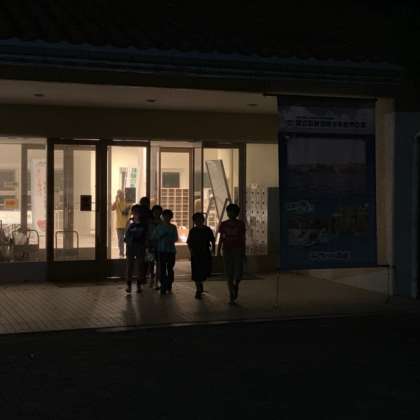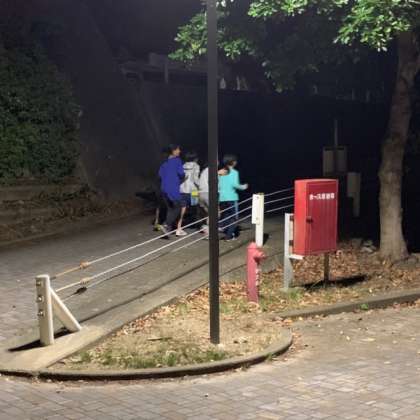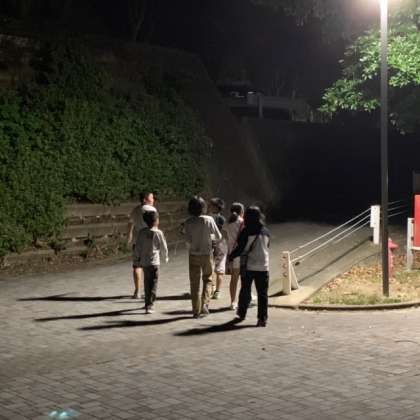 2日目の夜のナイトハイキングです。グループでかたまって,団結力を示す場面です。