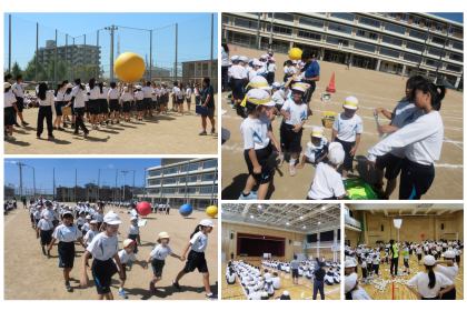 今日は初めて4つのたてわり競技を練習する日でした。1〜9年生までが一緒になって大玉送りや玉入れなどの競技練習に取り組みました。9年生が小さい学年の子たちを誘導したり,声かけをしたりする素敵な姿がたくさん見られました。