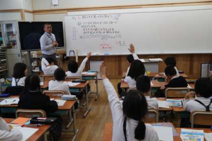 「11人が1列にならんでいます。みさきさんの前には5人います。みさきさんのうしろには何人いますか。」という問いについて自分で考えたり,グループで話し合ったりしました。図を描いたり式を書いたり,自分の考えを伝えていました。