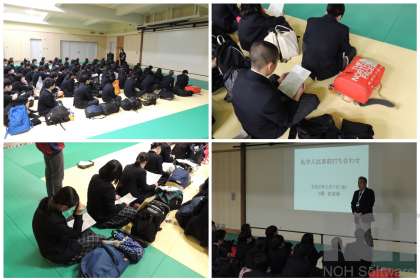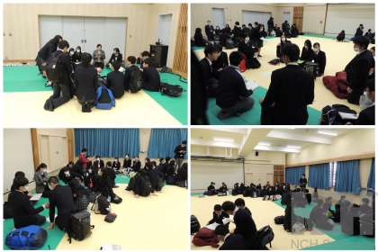 いよいよ来週月曜日から京阪神の私学入試が始まります。本日7日(金)6限,受験する9年生が,武道場に集合して事前打合せが行われました。校長先生からの激励と,進路指導主事の先生から入試に向けての注意等の説明がありました。来週も寒い日が続きそうです。受験生の皆さん,早めに家を出て,余裕を持って会場に着けるようにしましょう。教職員一同,皆さんの健闘を心から願っています。がんばれ向島秀蓮生!!
