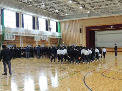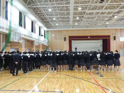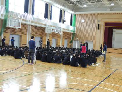 本日の5限,チームステージの「9年生を送る会」の練習を行いました。前回は先週,練習のパートに分かれて練習しましたが,今日は体育館で練習を行いました。