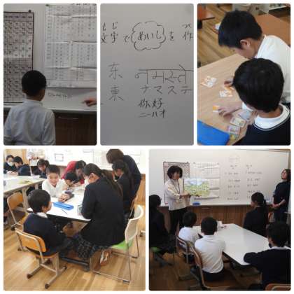 普段は個別での学習が多い国際教室。今日は,放課後を利用して,学年の枠を超えての交流会が実施されました。ネパール語,韓国語,中国語での「こんにちは」や「ありがとう」などを紹介してもらったり,文字を紹介してもらったりしたあと,いろんな言葉で自分の名刺作成にチャレンジしていました。普段あまり顔をあわせることがないため,このような機会をつくり,国際教室で学ぶ生徒のみなさんのタテのつながりができればと思っています。