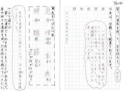 新出漢字の練習だけではなかなか定着しません。下のノート例を参考にしながら,自主学習ノートに練習してみてはどうでしょう。