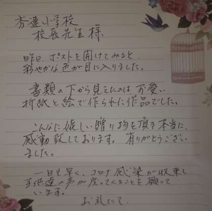 今回お礼のお手紙をいただきましたが,お礼を言わないといけないのはこちらの方です。お手紙をこのようにホームページで紹介させていただいておりますことが失礼にならなければとは思いながらも,あまりのうれしさにアップさせていただいていることをお許しください。本当に心温まるお便りをありがとうございました。これからもいろんな形で地域の皆様と心がつながれるよう学校としても取り組んでいく所存です。今後ともどうぞ地域の皆様の温かいご指導ご鞭撻の程よろしくお願いいたします。
