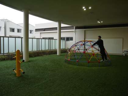 たのしそうなゆうぐがみえますね。かまだせんせいがあそんでいるよ。