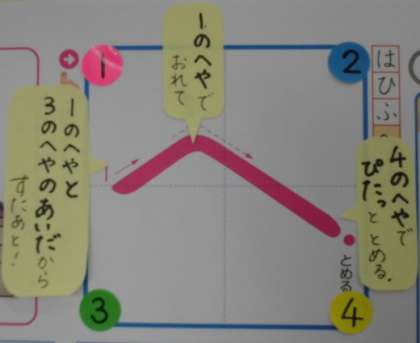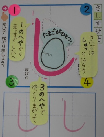 つぎは,ゆびで おてほんの おおきなじを なぞってみましょう。「○のへやから はじまって・・・」「さいごは とめる」などと こえにだしながら なぞりをすると,おぼえやすいよ。