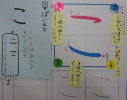 ひらがなは,どのじも すこしまるみがあって,ふわっと やさしいかんじのする もじです。きょうの「い」と「こ」も,よーくみると,どのせんも まっすぐなようで まっすぐでないですね。そんなところに きをつけて かくと,じょうずにかけます。きょうも,ひとつひとつ よくみて かいてくださいね。