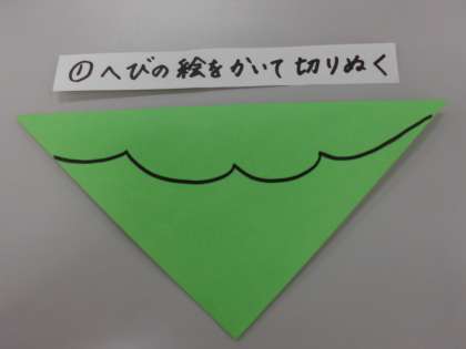 (1)へび(つくりたい生き物)の絵をかいて切りぬく。