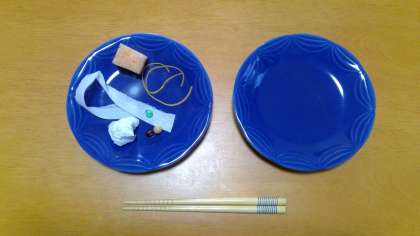 (1)かたほうのお皿に,つまむものをすべて入れる。