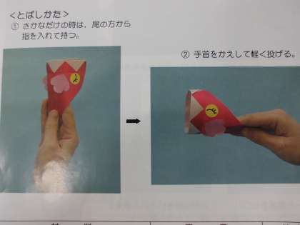 おりがみをつかって,とばしてあそぶ,おもちゃです。