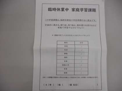 *「保健関係の書類」「下校先の確認」「同意書」「生徒個人票」「キャリアパスポート」「漢字辞典・分度器の申し込み(希望制)」「インターネット環境についてのアンケート」が,まだ提出されてない方は,登校する際にお持たせいただきますよう,よろしくお願い致します。