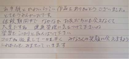 毎朝見守りをしていただいている方から先週末にいただいたお便りです。この休校期間中もずっと見守りを続けていただいていました。「みなさんの笑顔に会えますようにこれからもみまもっていきます」と書いてありました。この休校期間中に,地域の方からこのようなお便りをいただく度に,自分の生き方が恥ずかしくなるといった気持ちを感じております。地域の子どもたちにやさしい目を向け,温かい言葉を届け,その上見守り等の活動を継続していらっしゃる。何か生き方を教わっている気がします。本当にありがとうございます。この言葉以外に十分な言葉が見つかりません。今後ともなにとぞよろしくお願いいたします。ありがとうございました。