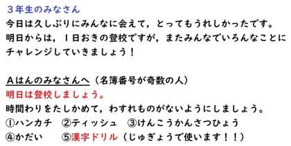 明日からは,いつもどおり8時から8時25分までに登校します。