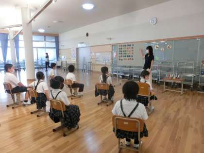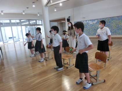 今日の音楽の授業は,広い給食室前ホールで「ミュージックベル」の演奏をしました。