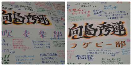 ソフトテニスの代替試合はすでに終了しておりますが,それ以外の運動系の代替大会が明日以降に実施されます。今回は一部を除き,保護者の方,教職員の観戦が制限され,無観客で行われることになってしまいました。例年,最後の大会には9年の教員をはじめ教職員も応援に駆け付けることが多いのですが,今回はそれもかないません。少しでも応援している気持ちを伝えようと,教職員からの寄せ書きを作成して各部に渡すことになりました。卒部式を間近に控えた吹奏楽部への寄せ書きも作成し,最後の舞台に臨む各部にエールを送りたいと思います。
