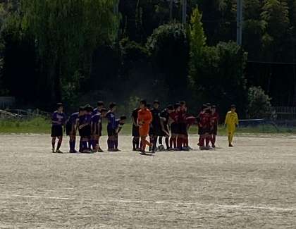 試合終了です。2ー0で勝ちました。次もがんばってください。広いグランド…写真が小さくなりすみません。32番と11番の二人がゴールを決めました。ホームページでは名前は控えておきますね。