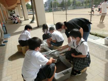まずは,1学期に育てたトマト,ピーマン,ナスの土をキレイに。