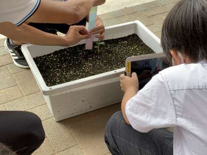 色つきのものさしを横に置いて,タブレットで写真を撮り記録します。
