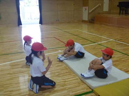 1年生のマット運動では,ゆりかごや丸太転がり,前転などの練習をしています。友だち同士で見合ったり,アドバイスし合ったりして,どんどんできる技が増えています!安全にも気を付けて活動できています!