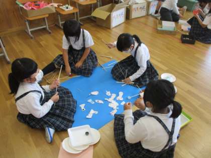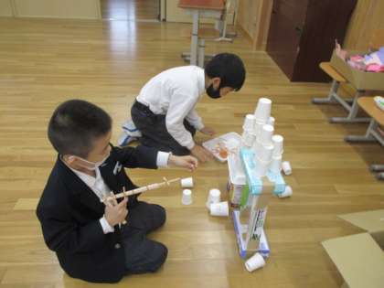 生活科「あそんでためしてくふうして」では,おもちゃ作りが着々と進んでいます。