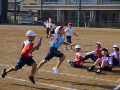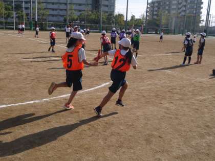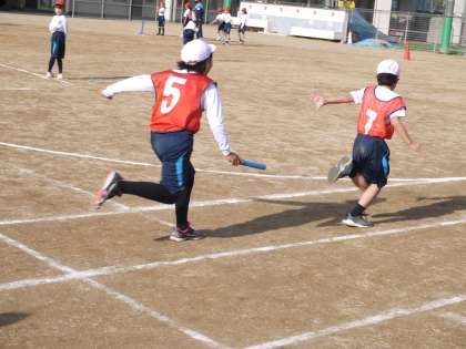 学習の後半で,いよいよリレーの勝負です。バトンを渡す練習の成果がたくさん見られました!走り終わった子どもたちの顔がとても良い表情でした!