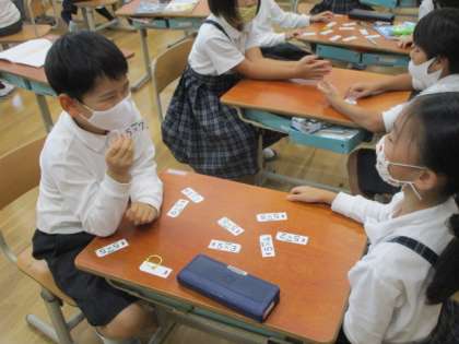 九九カードを使って,繰り返し練習をしたり,友達と問題を出し合ったりしています。