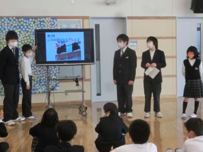 1組1〜9年生で「向島探検ツアー」のふり返りをしました。う・え教室の生徒が,校区探検で調べたことを地図にまとめたり,クイズにして下級生に発表してくれたりしました。発表を聞いていた下級生は「校区について,知らなかったことをたくさん知ることができました」「またみんなで探検に行きたいです」などの感想を発表することができました。