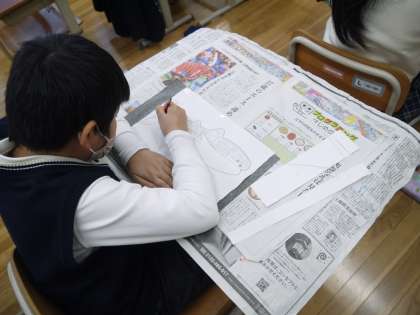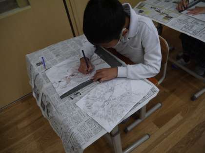初めてカーボン紙を使う子どもたちは,なぞった線が