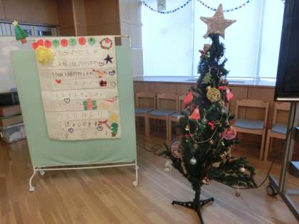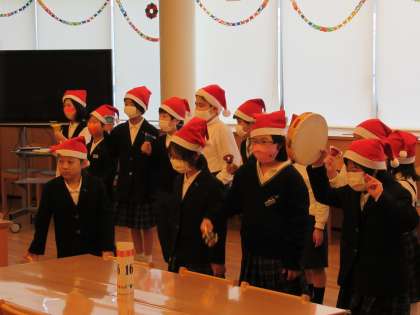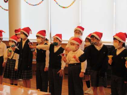 12月11日,待ちに待った1組のクリスマス会がありました。とても楽しみにしていた子どもたち…何度も時間割を見直して「あと〇日でクリスマス会だね」と,わくわくしていました。1時間目にランチルームをきれいに飾りつけしてくれた,う・え組のお兄さんたち,「すごーい!お部屋がクリスマスになってる!ありがとう」「私が作ったかざり,つけてくれてありがとう」と大感激の子どもたちでした。クリスマス会のプログラムは…1.はじめの言葉 2.あ・い組の出し物 3.う・え組の出し物 4.ケーキデコレーション 5.プレゼント交換 6.ふり返り 7.集合写真 8.終わりの言葉 でした。出し物を披露したり,手作りケーキを食べたりプレゼント交換をしたり…とても楽しいひと時となりました。そしてそして!なんといっても子どもたちが待っていたのはサンタさん!!「やっぱり今年も来てくれたんだね!」「あれ??でも去年のサンタさんと違うなぁ」「すごい!サンタさん英語をしゃべってるよ。本物だ!」と大興奮の子どもたち,どんなサンタさんだったのか,お家でも聞いてみてくださいね。