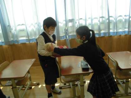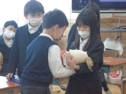 「身長は何センチかな?」「30センチものさしと同じ大きさや!」「3000gは3kgやで」と子どもたちは算数で習った知識を使いながら大きさを想像していました。そして,実際に赤ちゃん人形を抱いて,生まれたての赤ちゃんの重さを体験しました。「思ったより重い!」「首がふにゃふにゃや,支えて!」とみんな落とさないように大切に赤ちゃん人形を抱いています。