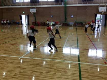 相手のチームの陣地に向かって歩いていき,ドンじゃんけんの「ドン!」の代わりに「〇〇さん,こんにちは」「□□さん,こんにちは」と挨拶をします。新しいクラスの友達の名前を覚えるのにぴったりでした。みんな嬉しそうに名前を伝え合っていました。
