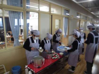 給食がスタートしましたが6年生ともなると,自分達で考えて準備や配膳ができています。これまでの積み重ねの成果でもありますが,すばらしいことだと思いました。自分達で考えてできることは「自立」に向けて大切なことです。自分で考えて行動できる人を目指して,これからも継続して取り組んで言ってほしいと思います。
