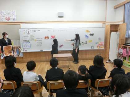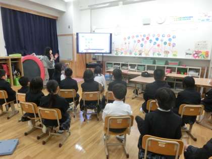 今日の「みんなのえいご」の時間では,「えいごであそぼう」をめあてに英語に楽しく慣れ親しむ活動をしました。「今年の英語はどんなことをするのかな〜」と,とても楽しみにしていた子どもたち…英語のあいさつや歌,絵本,ミッシングゲームなどとても楽しく学習していました。