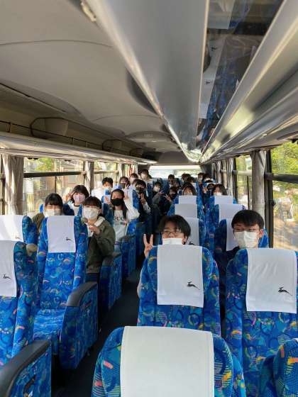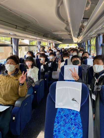 バスの中です。バスは5分に1回は空気が入れ替わる換気システムが装備されているとのことです。バスは今、宇治西インターより、京滋バイパスに乗りました。