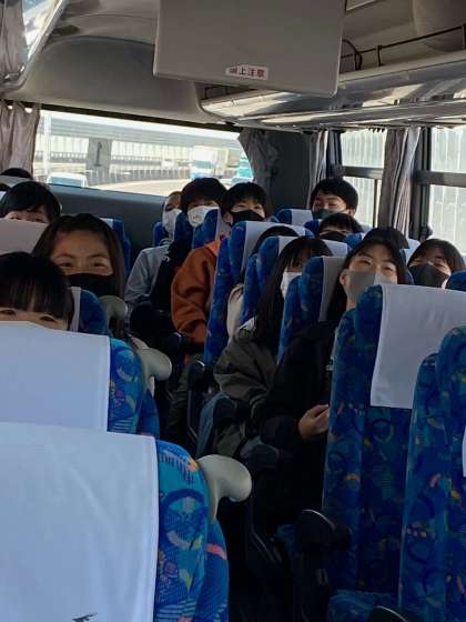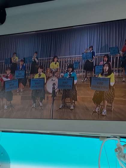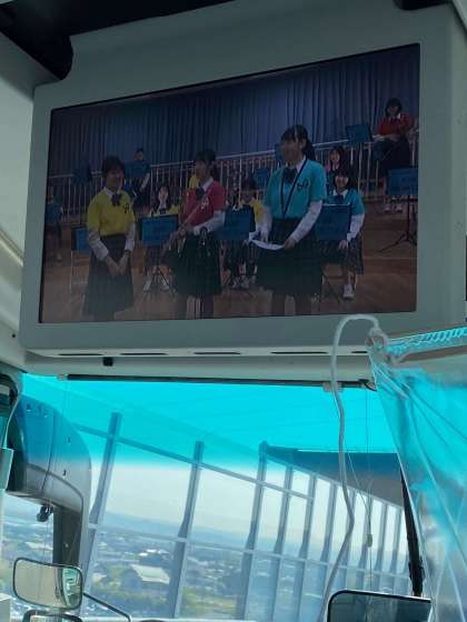 今、各バスの中ではこの修学旅行のために制作された動画を視聴しています。写真は、吹奏楽部によるイントロクイズが流れている様子です。