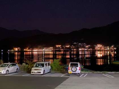 消灯の時間が過ぎ、廊下はとても静かです。部屋の中はどんな感じなのでしょうか?ヒソヒソと話をしているのか、それとも疲れて眠っているのでしょうか?番外編として河口湖の夜の写真をどうぞ。