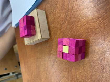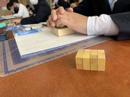 1時間目は,積み木を使って直方体や立方体の立体作りをしました。子どもたちは,初めて見る1㎤の大きさに「小さい!!」と,大変驚いていました。色々な16㎤を作ったり,30㎤のお城を作ったりするなど,とても楽しそうでした!そして,1㎤がいくつ分かを見て,体積を求められることが分かりました。