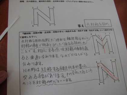 算数の「対称な図形」の単元の最後に,学習したことを生かしてレポートを作成しました。学習した語句を活用して説明するという課題ですが,苦戦しながらも先生に教えてもらい作成していました。学習したことを活用する力をつけることを,今後も授業で進めていきます。
