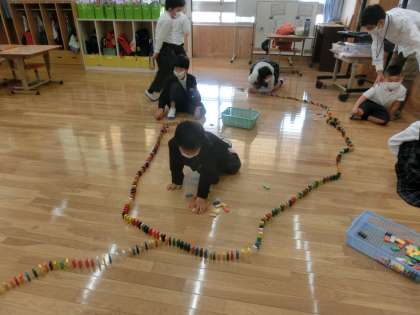 はじめは一人で自分の机に並べました,次に数人のグループで,最後に全員で!学習の後半は「大きなドミノにしたい!」という目標を「なんとかして達成させたい」という思いが出てきて、試行錯誤しながら取り組んでいる姿がステキでした。