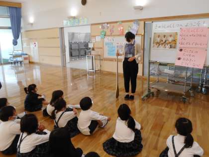 給食の先生の廣瀬先生からは,給食のことを教えてもらったり,大きなしゃもじも見せてもらったりしました!