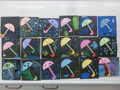 雨,かたつむり,カエル,てるてる坊主,あじさい,かさ,レインコート,ながぐつ…子どもたちからたくさんのイメージが出てきました。雨が降っても楽しい気もちになれる掲示ができました。