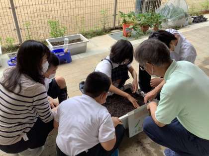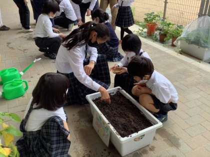 1組1〜9年生のたてわりの授業で夏野菜を育てます。今年は「きゅうり」「おくら」「枝豆」です。今日はグループごとに分かれてプランターへの種まきです。それぞれの班で,リーダーが中心となって声かけをしながら丁寧に種を植えました。「どんな芽が出てくるかな」「水やりしないとね」などの声が聞こえてきました。植えた種はどんな姿に成長していくかな?楽しみですね☆