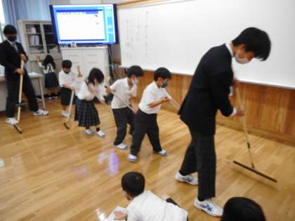 毎週火曜日と木曜日は全校清掃です。1年生の教室と廊下には9年生のお兄さん・お姉さんが掃除を教えに来てくれます。