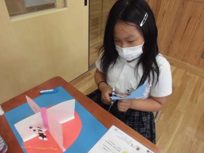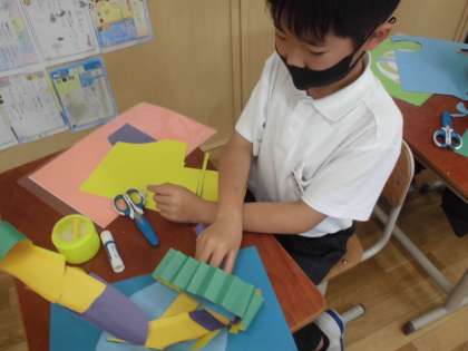 わりピンを使ってくるくる回る仕組みを作り,画用紙を切ったり貼ったりして,自分がイメージする世界を表現しています。