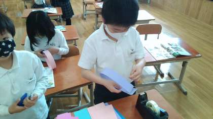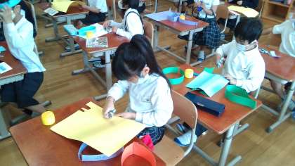 図がこうさくで,細長い色画用紙に わゴムをかけてホッチキスでとめ,わっかをつくりました。