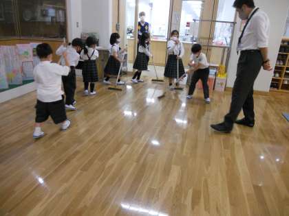 1年生は短いほうきを用意してもらっているのですが,それでも自分の背の高さくらいあるほうきなのです。掃こうとしたら自分のおでこに当たりそうになったり,自分の足や友達の足に当たりそうになったり。四苦八苦しながらほうきと仲良しになることから初めています。
