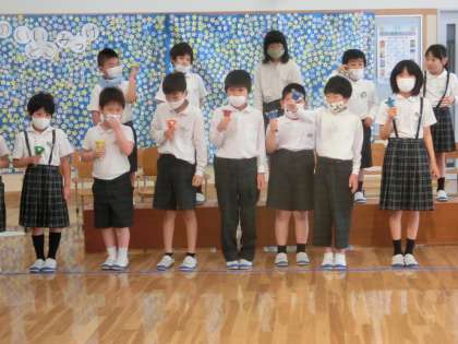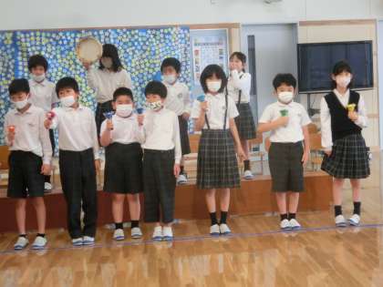 「1組あ・い」と1〜4年生との交流会「なかよし会」にむけて,司会進行,自己紹介,ミュージックベル,クイズ大会の練習をしています。来週からは,いよいよ「なかよし会」がはじまります。「なかよし会」を通して,みんなとますます仲良くなれるといいなと思います。