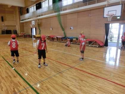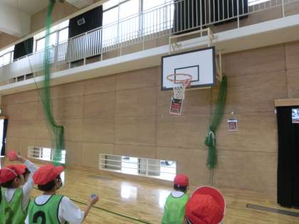 「まとあてゲーム」の学習では,ボールに慣れる活動「ボールつき」「壁ぶつけ」「バウンドキャッチ」「ネット越え」などの練習をしています。投げる,とる,キャッチボールといったボール操作を正確に行えるようになってきた子どもたちです。